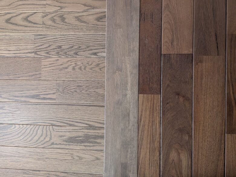 左側がオーク無垢床、右側がチークの挽板です↓